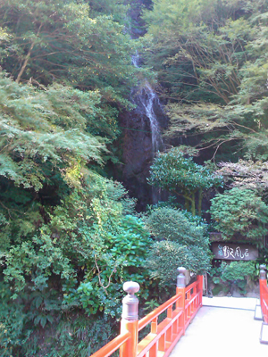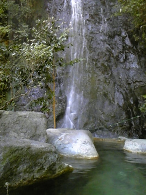 女性陣たちは先に滝の流れる露天風呂につかってきて、
