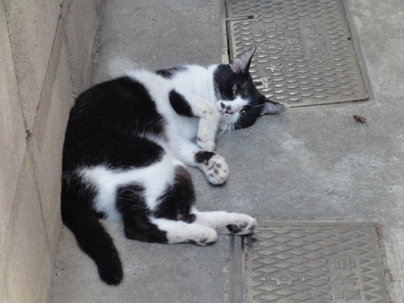 飼い猫でしょうか?まったく人間を恐がらずに腹をだして寝ていました。(笑